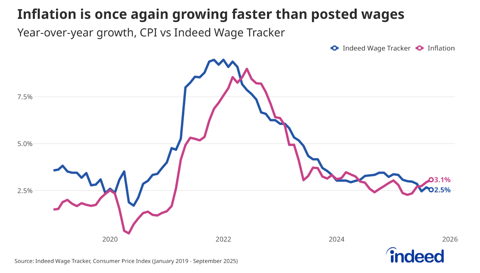 Indeed’s Job Postings Index fell from 111.7 on Jan 1 to 101.7 by October—signaling a broad cooldown in job postings and slower hiring across most professional sectors.