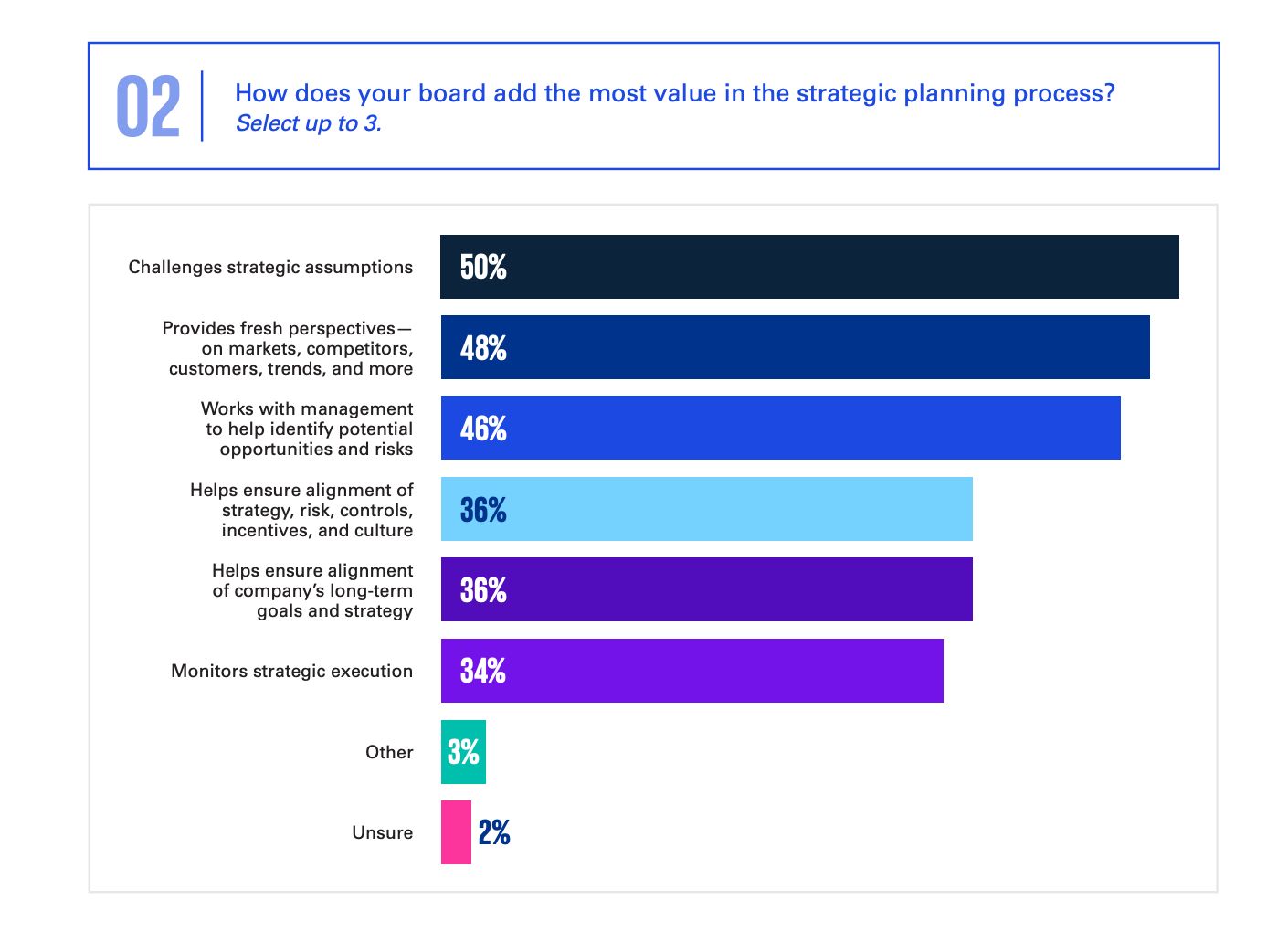 Boards themselves also play an important role. The most helpful contributions come from questioning assumptions, offering outside perspectives and helping leaders spot risks or opportunities they may not see on their own. GenAI is another area where confidence is low, with fewer than one-third of respondents feeling prepared to oversee its use or governance.